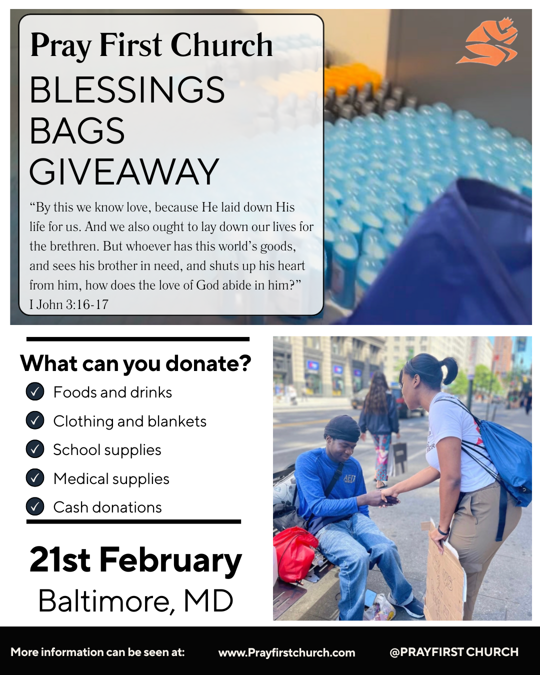 Pray First Church will be hosting another Blessing Bag Giveaway in Baltimore City. We will be distributing food, clothing, toiletries, shoes, community resources, and more. We are currently seeking volunteers to assist with this event.